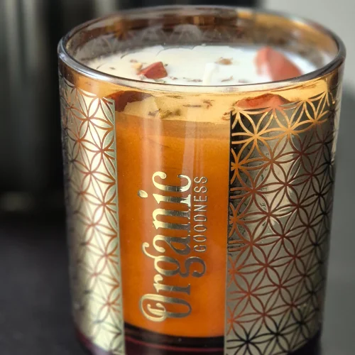 De kaars wordt geleverd in een decoratieve glazen pot met het krachtige Bloem des Levens symbool – een eeuwenoud patroon uit de heilige geometrie dat staat voor de eenheid en verbondenheid van al het leven in het universum.
